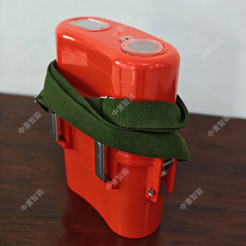 未使用时所有系统装置都装在壳体之中,使用者能通过上盖观察窗看到压力表的压力指示。在下壳上设有皮带孔和背带,使用者可固定在矿工皮带上或挎在肩上。